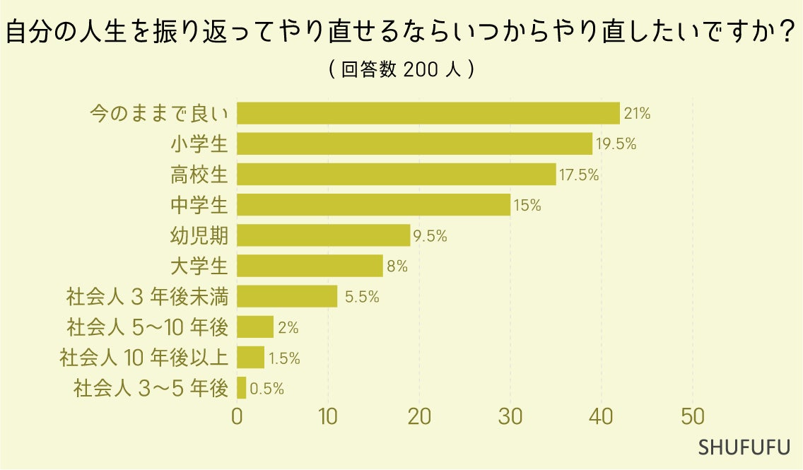 自分の人生を振り返ってやり直せるならいつからやり直したいかを尋ねたところ、1位は「今のままで良い(21%)」、2位「小学生(19.5%)」となりました。現状に満足している人が多い結果になりました。「過去に行きたい」という選択肢を選んでいた人が多かったですが、過去を変えると現状が大きく変わってしまうこともありそうですからね。
