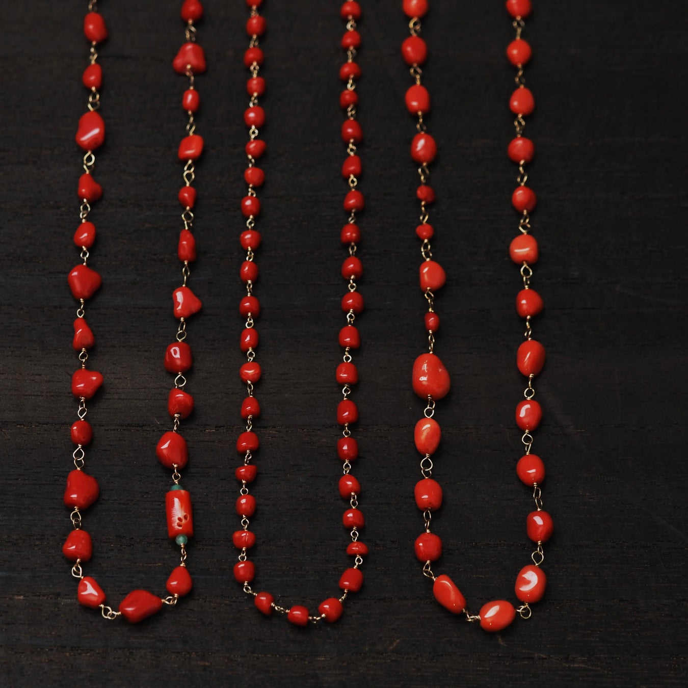 さらに今回のトランクショーでは、イタリア・サルデーニャ島近海で採れる「サルデーニャ珊瑚」を使用した新作ジュエリーも登場。ややオレンジを帯びた上品な赤が印象的なこの珊瑚は、温かみのある艶と深い色味が魅力です。細身のチェーンに浮かぶようにあしらったネックレスは、日常にやさしい彩りを添えてくれます。