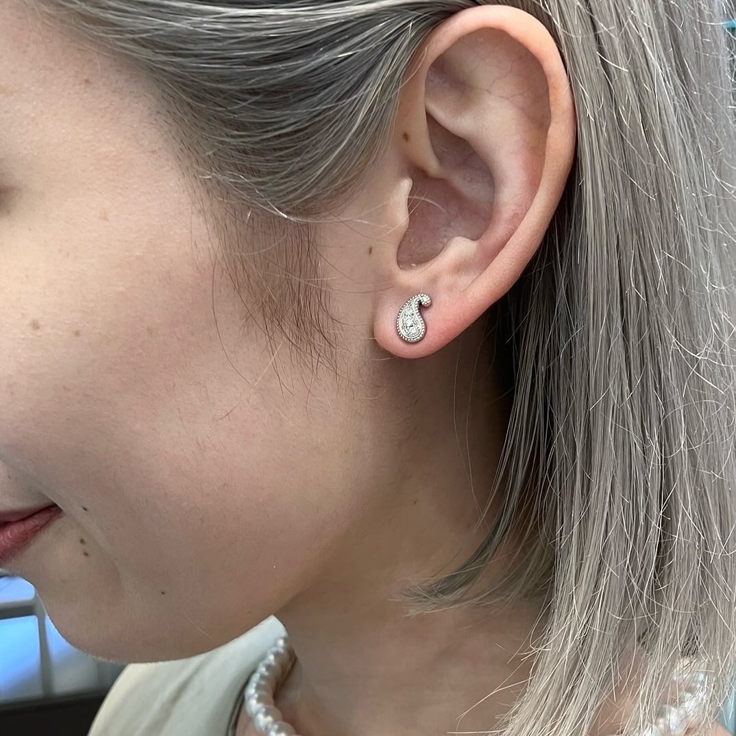 今回は、関西圏のパーセル ジュエリー店舗で唯一ミルグレイン ピアスを愛用するスタッフ・松本(@manaka_parcelle)が企画いたしました。期間中は、松本自身も愛用している3つのモチーフ「ペイズリー」「スター」「マーキース」の実物サンプルをご用意しております。そのほかのモチーフもオーダーいただけますし、また、すべて片耳からオーダーいただけます。