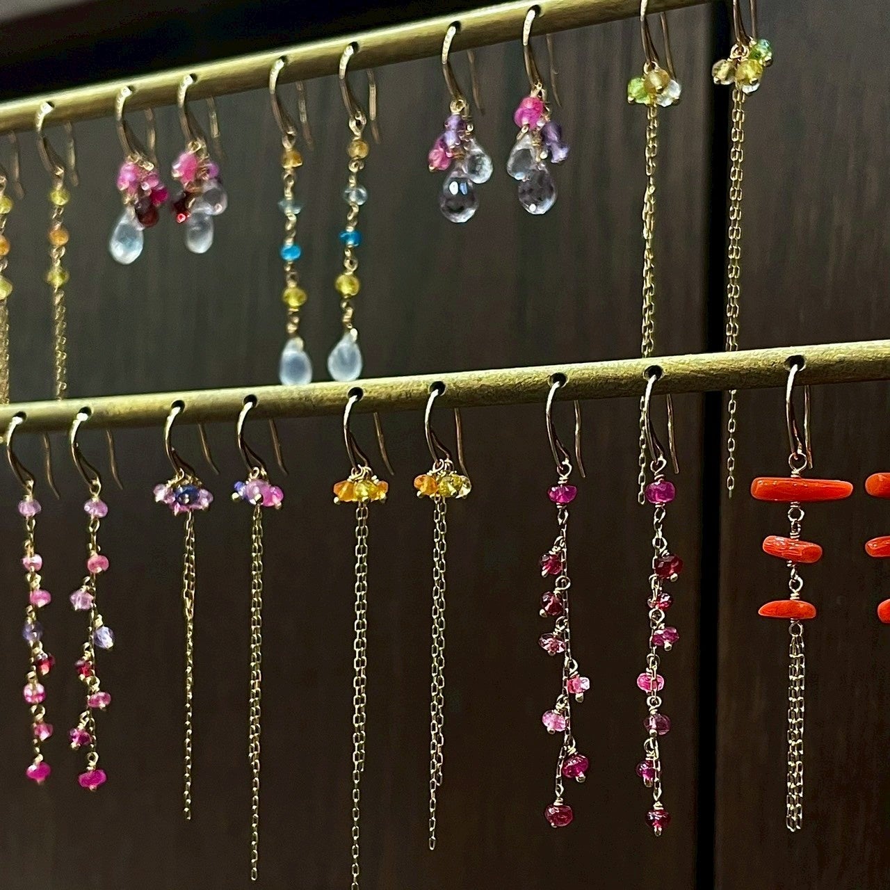 今回ご紹介する「リアン ピアス」は、金線を一本一本捩じりながら宝石を留める「シャンク巻き」という技法を用いて、100通り以上のカラーストーンの組み合わせからお選びいただけるセミオーダー仕様。耳元で揺れるチェーンとカラーストーンが織りなす、軽やかで華やかな印象が特徴。巻き終わりの金線はレーザーで溶接、肌や衣服に引っかかりにくくなっております。フック部分までも既製パーツではなく、職人が一つずつ手作業で仕上げたオリジナル。その曲線が横顔を上品に引き立てます。