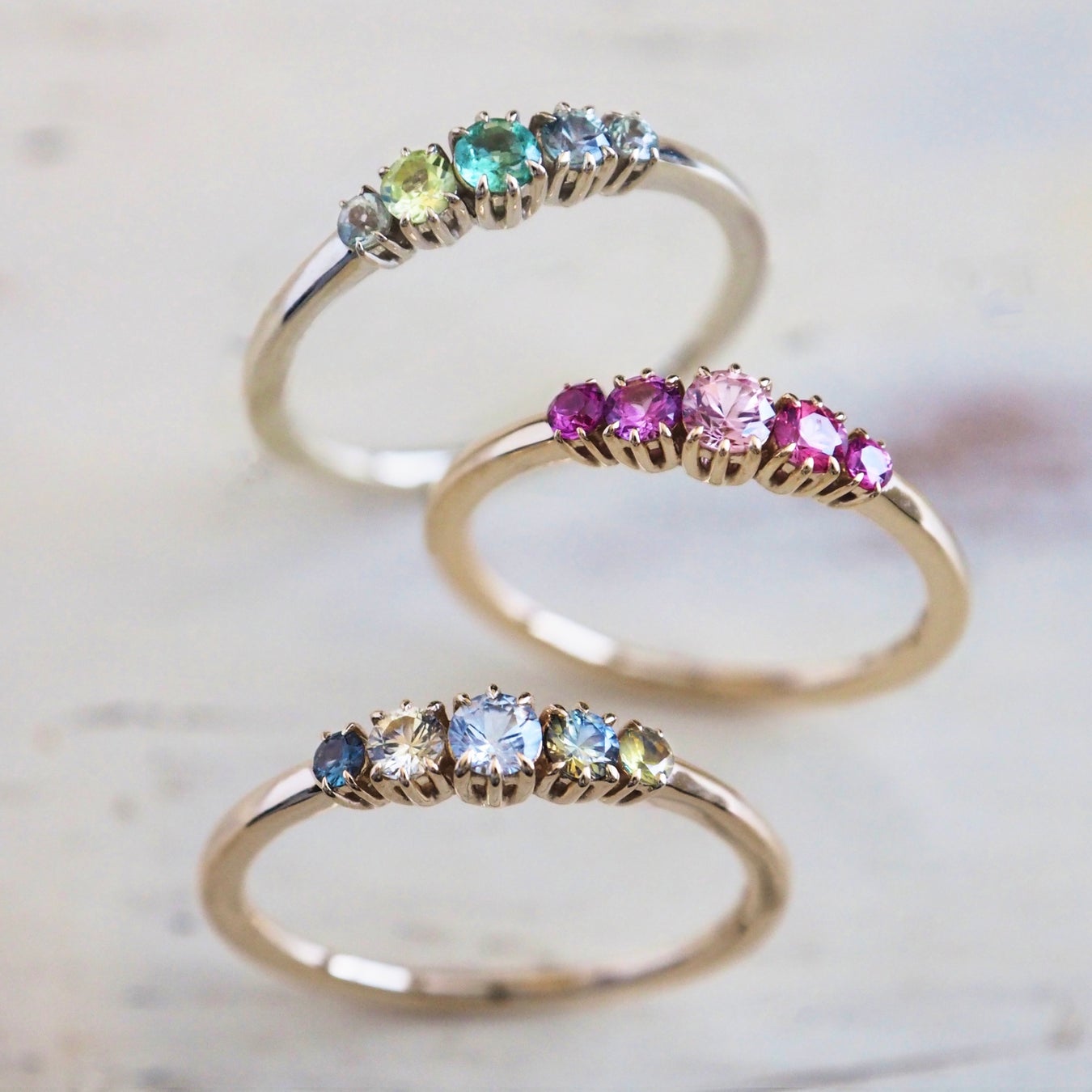 今回の目玉は、待望の復刻を果たした「Pomme(ポム)」リング。センターに3mmの宝石を配し、左右に2.5mm・2.0mmの石をグラデーションで並べた新仕様は、これまでの“ぎゅっと密度のある”印象とは異なり、軽やかで抜け感のある佇まいが特徴です。ダイヤモンド、ルビー、サファイア、エメラルドなど、色もカットも個性豊かなルースで構成されており、どれも一点ものの表情を湛えています。