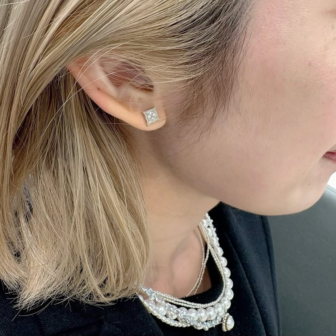 「ミルグレイン」と言えば、ホワイトダイヤモンドをプラチナプレートに彫り留めし、縁には職人の手によるミル打ちを施した、精緻な意匠が特徴の人気シリーズ。アイテムとしては、リングやペンダントの印象が強いシリーズですが、実はピアスも“受注生産”というかたちでご用意が可能です。
