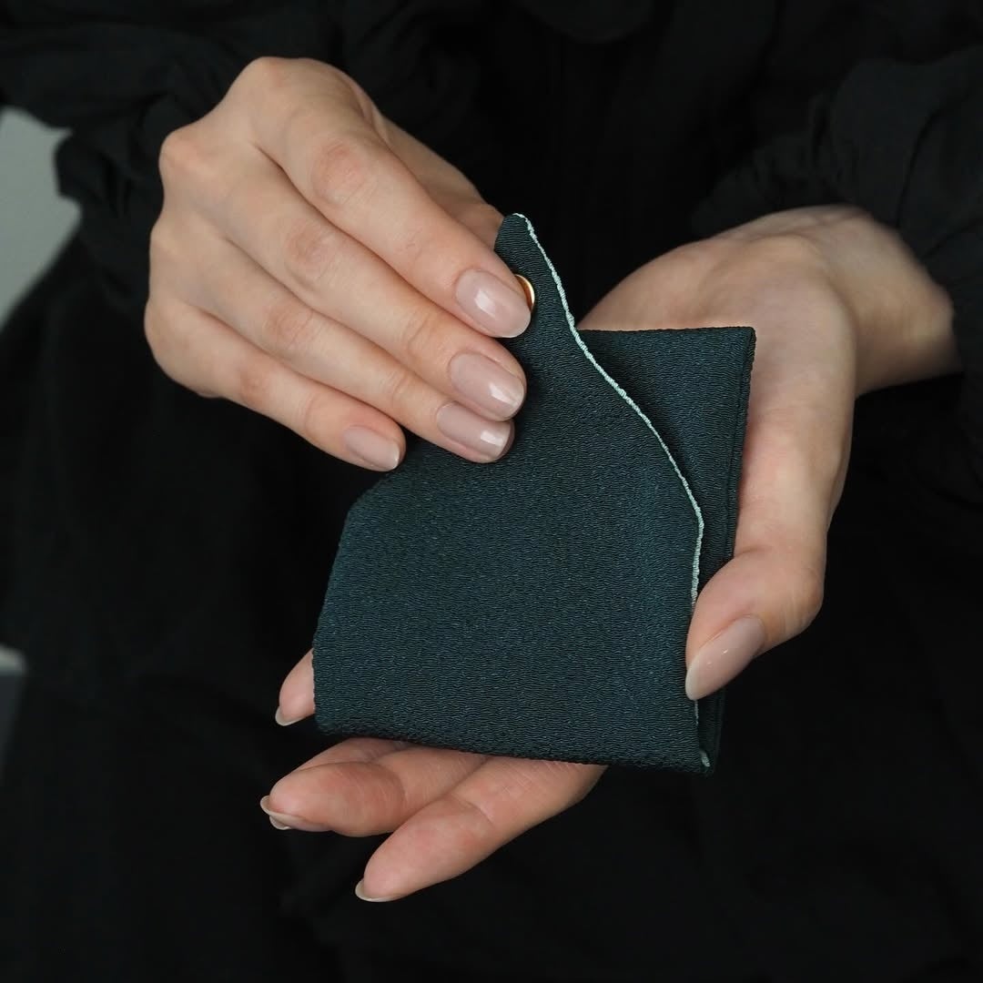 このポーチは、ブランド名の由来にもなっている“包む”という想いをかたちにしたもの。袱紗(ふくさ)をモチーフに、パーセルの象徴である“平包み”をイメージしたデザインでお作りしました。素材には、やさしい手触りのちりめん生地を採用し、深いグリーンの色味が落ち着いた印象を添えます。内側にはリングを収めるクッション付きで、ジュエリーと一緒に持ち歩く際にも便利な仕様となっております。