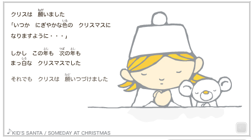 主人公の女の子クリスと白いくまが、にぎやかなクリスマスを願いつづけると虹色の雪がクリスマスに降ってくる・・・クリスマスの定番「Someday At Christmas(いつかクリスマスの日に)」に合わせてストーリーが展開します。