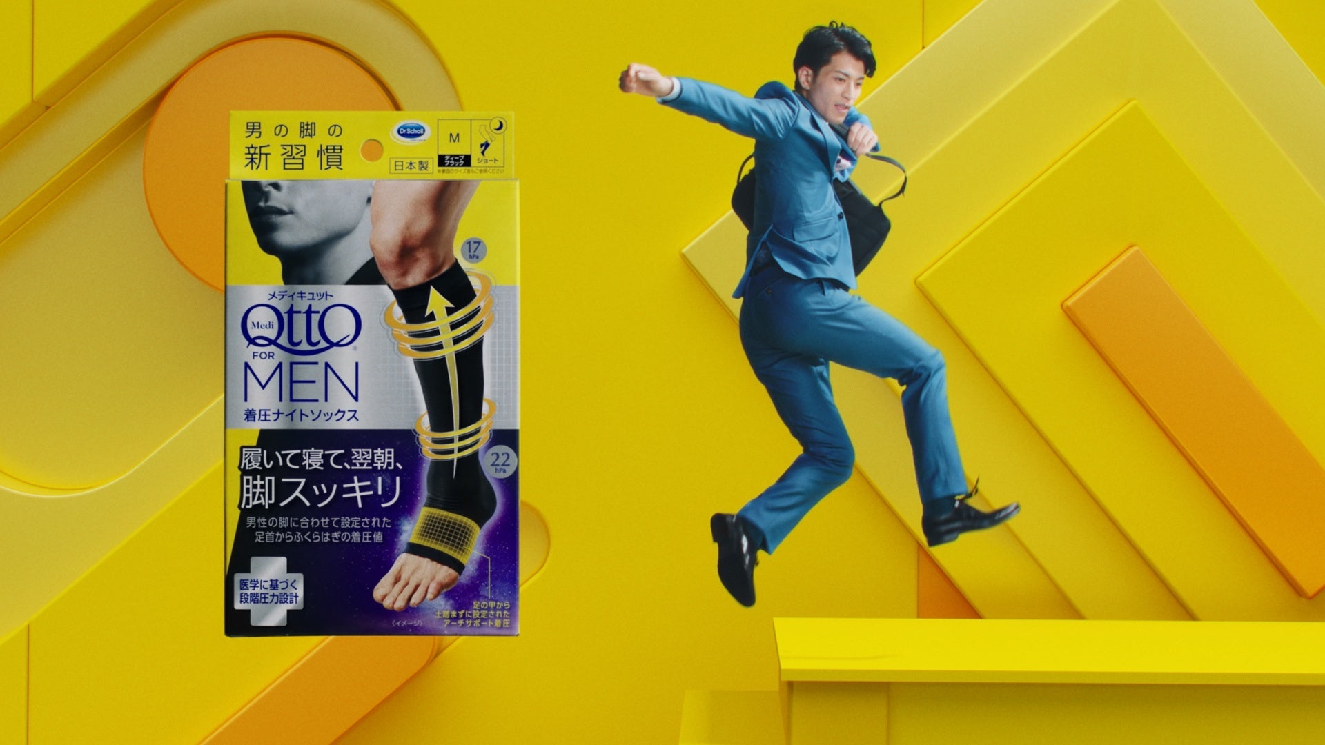メディキュットから男性向け製品が新発売することに際し、新TVCMを放映予定。男性が「メディキュット For MEN 着圧ナイトソックス」を着用して、寝ている間に脚を集中ケア。男性の脚に合わせた足首からふくらはぎの段階着圧で、脚を引き締めます 。メディキュット For MEN が叶える、 履いて寝て、翌朝スッキリした脚への満足感を描きました。