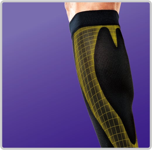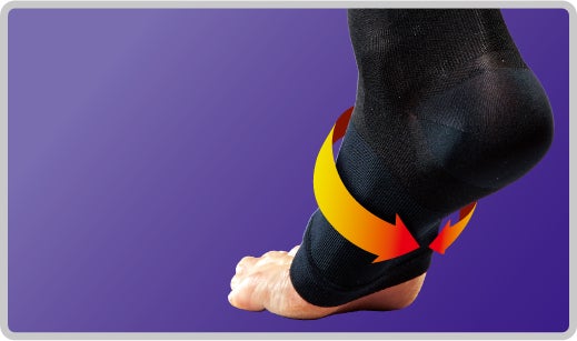 ふくらはぎの筋肉に沿ったUカーブテーピング加工と着圧でふくらはぎをホールド。 さらに、アーチサポート着圧は足の甲と土踏まずの部分を囲むように着圧を設定。
