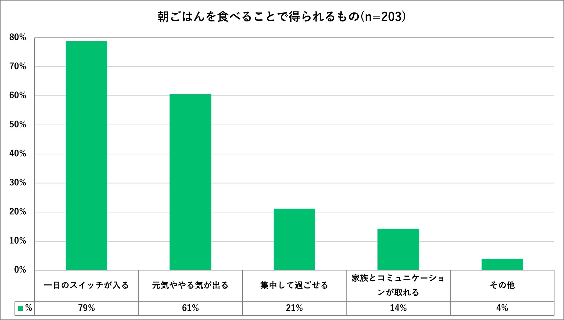 朝ごはんを食べることで得られることとして「一日のスイッチが入る(79%)」や「元気ややる気が出る(61%)」といった「心身の活力を得る」項目が上位を占めています。朝食は1日の活動を始めるための切り替えとしての役割が大きいことが推測されます。