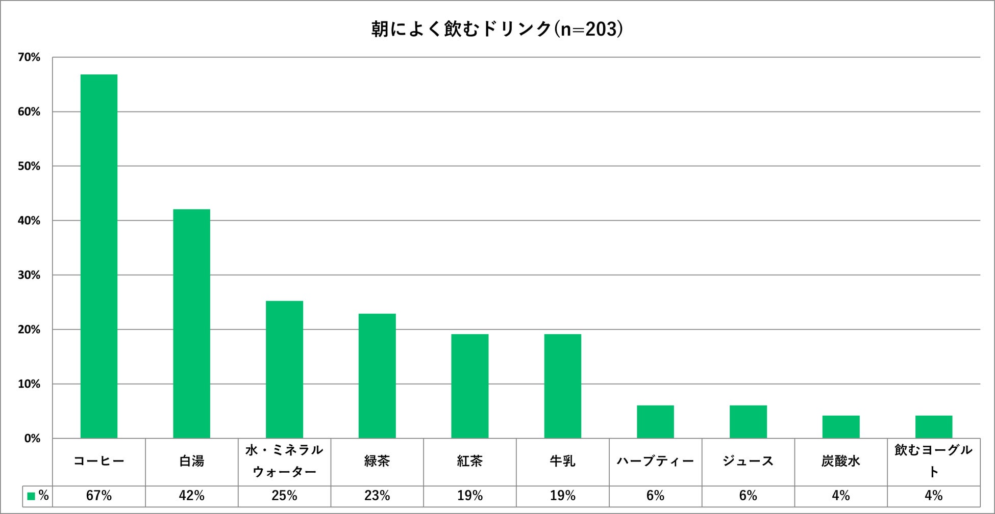 朝によく飲むドリンクは「コーヒー(67%)」が約7割と大きく支持されています。一方で近年人気が高まっている「白湯(42%)」や「水(25%)」など健康志向や水分補給を重視する選択肢も支持されています。
