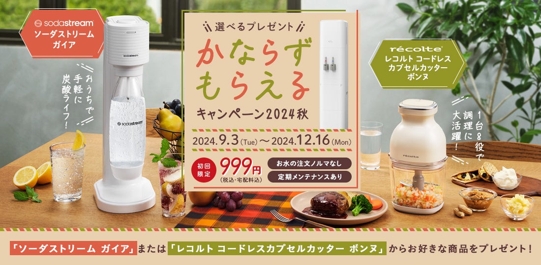 「ソーダストリーム ガイア」または「レコルト コードレスカプセルカッター ボンヌ」からお好きな商品いずれかをもれなくプレゼント