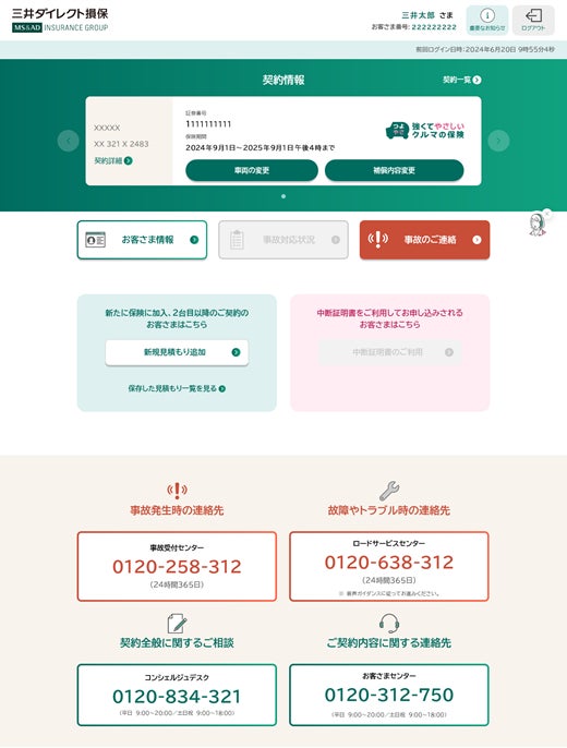 マイページトップ画面で「契約情報」「継続手続き」「事故連絡」等の表示や各種ボタンを上部に配置し、必要なお手続きをスムーズに行っていただけるよう見直しました(図3)。また、お客さま向けの重要なお知らせ・通知や、事故受付の連絡先等をマイページの見やすい場所に配置し、お客さまが大事な情報に視覚的に気づいていただきやすいユーザーインターフェースにしました。
