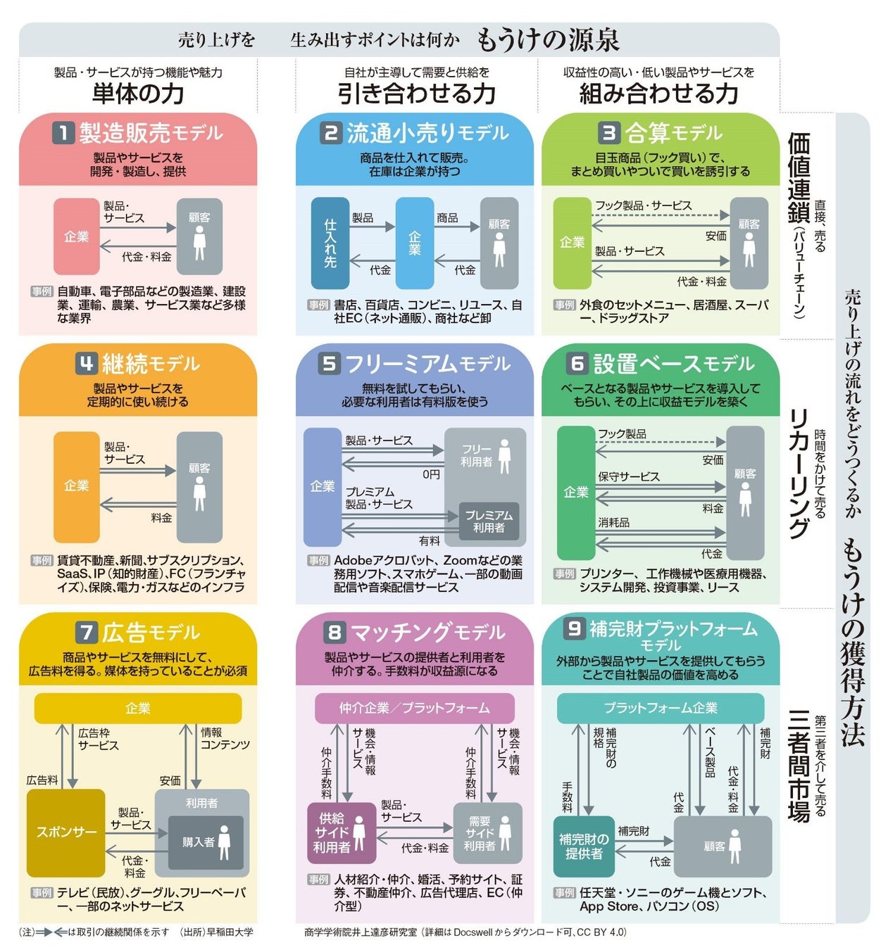 物価高騰、賃上げ、生成AI、脱炭素……。ビジネス環境が激しく変化する中、勝てるビジネスモデルも刻一刻と変わっていきます。話題の業界や企業はいかに稼いでいるのか、今後勝てる分野はどこなのか。ビジネスモデルを見極めるニーズは高まっています。本特集では井上達彦・早稲田大学教授の分析を基に、売り上げを生み出す「もうけの源泉(横軸)」と、売り上げの流れをつくる「もうけの獲得方法(縦軸)」の2軸で整理し、あらゆる取引関係を9つのビジネスモデルで図解しました。