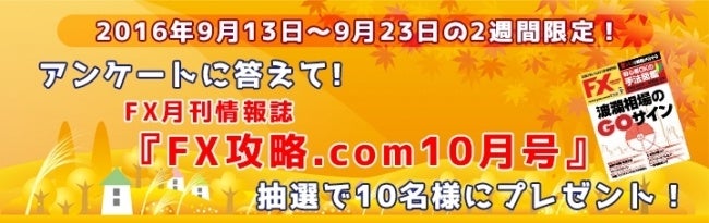 期間内にアンケートにお答え頂いたお客様の中から抽選で10名様に月刊FX情報誌「FX攻略.com」(9月21日発売)をプレゼント致します。