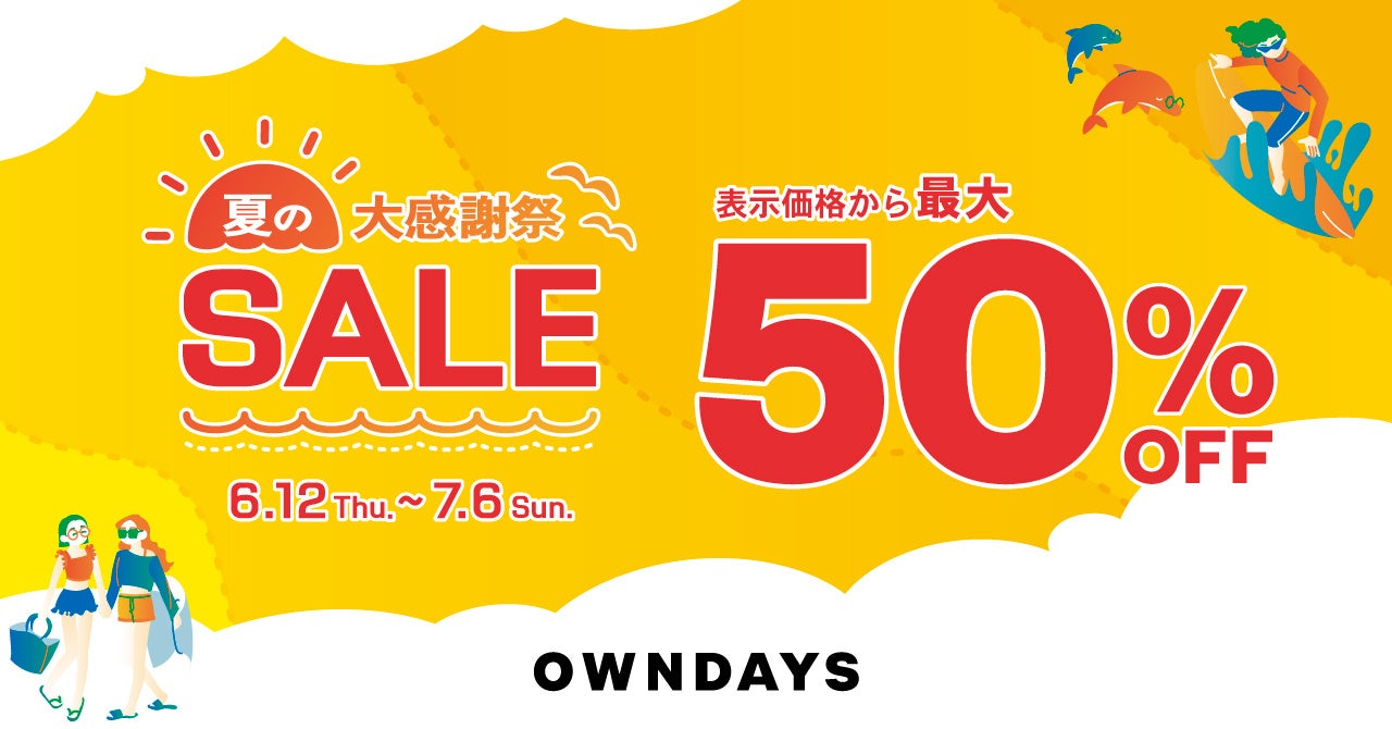 人気アイテムが今だけお得に買える夏の大感謝祭セールを実施します。シールの付いたフレームが期間限定で最大50%OFFでお買い求めいただけます。一部OWNDAYS|AIRシリーズの既存商品もセールの対象となっておりますので、お得な機会にぜひお試しください。