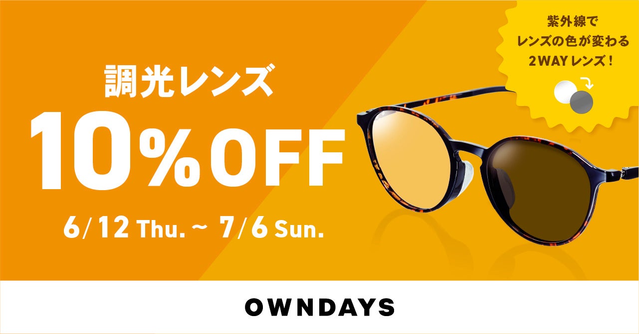 紫外線の量によってレンズの濃さが変化する「調光レンズ」が、期間限定で10%OFFになります。室内ではクリアなメガネ、屋外ではサングラスとして使える1本2役の優れものです。