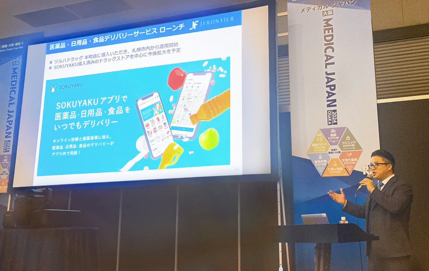 ジェイフロンティア株式会社(本社:東京都渋谷区、代表取締役社長執行役員:中村篤弘、以下「当社」)は、2024年1月17日(水)から2024年1月19日(金)にかけてインテックス大阪にて開催された「第10回 メディカルジャパン大阪(主催:RX Japan株式会社)」に出展し、当社が提供するオンライン診療・服薬指導・処方薬配送サービス「SOKUYAKU」の展示を行いました。また、特別講演「オンライン診療の課題と今後の展望(開催日:2024年1月17日、以下「本講演」)」に、当社代表取締役社長執行役員・中村が登壇いたしました。