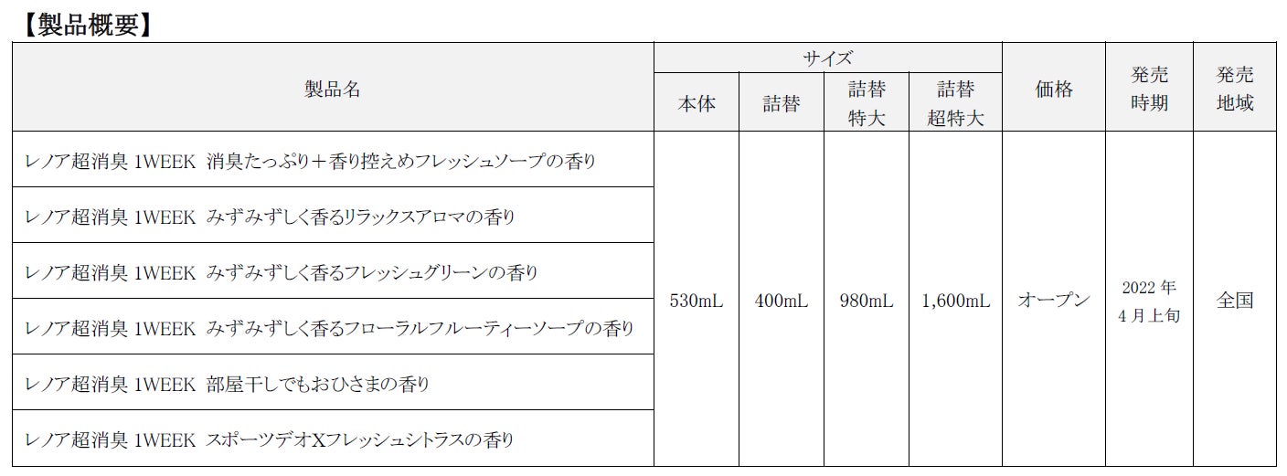 今回リニューアルする「レノア超消臭1WEEK」は、従来製品の長時間消臭技術に加え、抗菌成分を増量することにより、「1週間ずーっと続く長時間消臭*1&抗菌*2」効果を実現。毎日洗うことができない寝具や衣類の菌の増殖も長時間抑えることが可能となり、爽やかさが1週間続きます。また、「衣類の消臭はしたいが香りの強い柔軟剤は苦手」という消費者のニーズにも対応し、“しっかり消臭、でも香り控えめ”の新製品「レノア超消臭1WEEK 消臭たっぷり+香り控えめフレッシュソープの香り」を新たにラインアップに追加します。