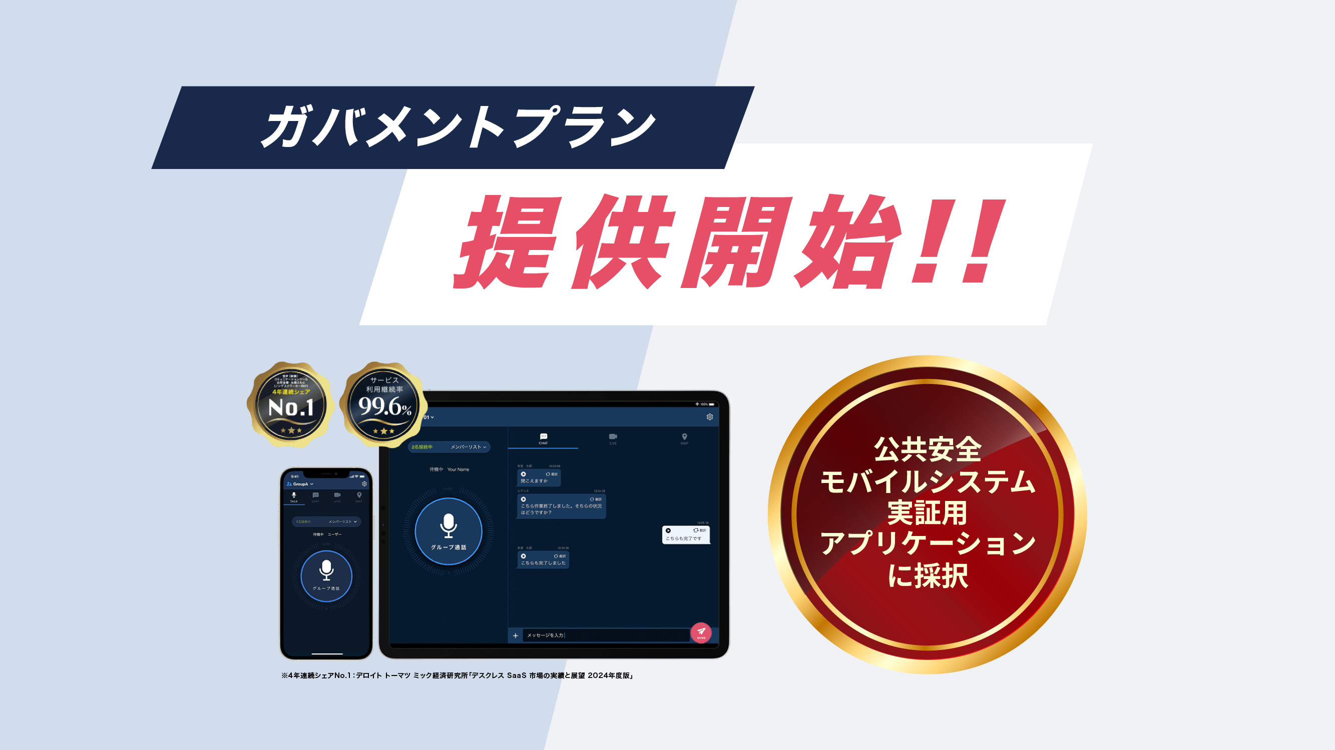 これらの背景の中、一般社団法人移動無線センターより提供されているMCA無線、MCAアドバンスのサービス終了の発表もあり、地方自治体でのBuddycomの導入が増えていることを踏まえ、この度ガバメントプランを提供開始することになりました。