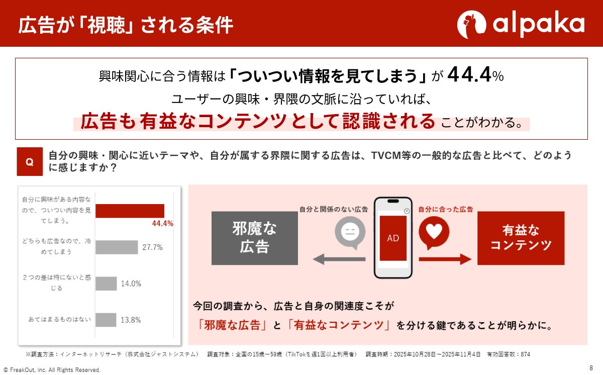 【フリークアウトが市場調査】「広告=嫌われる」は過去の定説。TikTokユーザーの約7割が、自分の「界隈(関心領域)」に合った広告なら「ブランドを好きになる」と回答