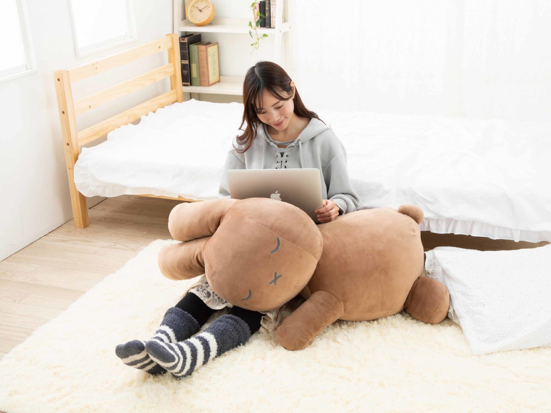 サイズが大きいからこそ、全身でその心地良さを感じることができるぬいぐるみ。よく使う場所に置いて優しく見守ってもらったり、膝の上に置いて一緒に仕事をしたり、休憩時間に抱きしめて癒しをもらったり…。