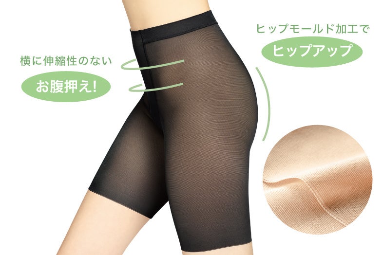 横に伸縮性のないお腹押さえでウエスト周りをすっきり見せ、ヒップ部分はモールド加工により自然に引き上げます。ボトムスとの摩擦が起きにくいなめらかな生地なので、パンツスタイルにぴったりです。足口はヘム仕様で段差が出にくく、ボトムラインを美しく整えます。