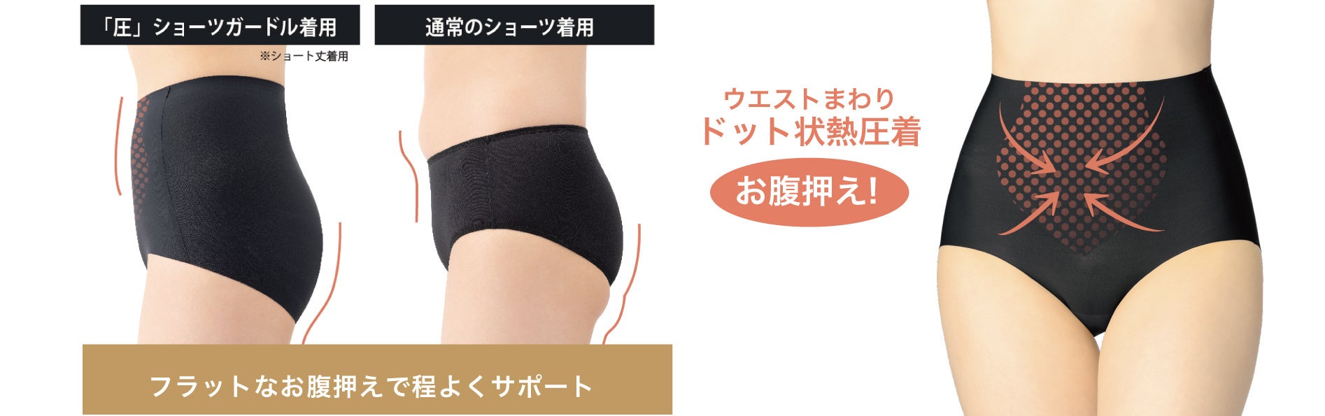 ウエスト周りに配置したドット状の熱圧着お腹押さえが程よいパワーでサポートします。お腹をすっぽりと包み込むハイウエスト仕様で、お腹の段差が出にくい形です。さらに生地自体に伸縮性があるため、補正機能と快適なはき心地を両立します。