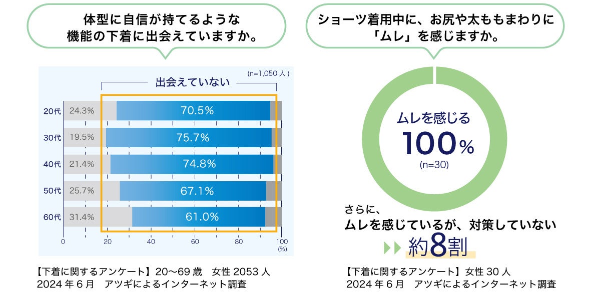 アツギの調査によれば、20代から60代女性のうち体型に自信が持てるような機能の下着に出会えていない人は約7割。そして、ショーツの着用中にお尻や太ももまわりに「ムレ」を感じていると答えた女性は100%。そのうち約8割の方は「ムレ」を感じていても対策できていないという結果でした。そこでアスティーグインナーは補正力と通気性を兼ね備えたショーツをご提案いたします。