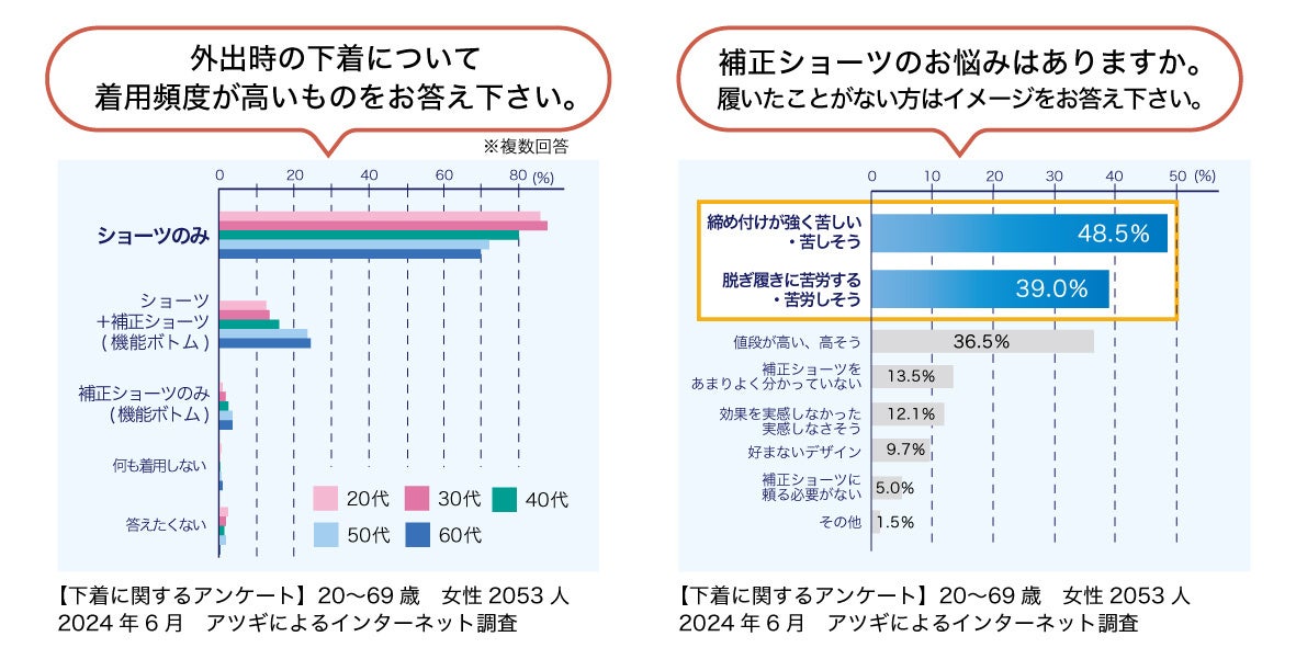 アツギの調査によれば、補正ショーツの使用者は少数派。締め付けが強く苦しい・苦しそうであること、脱ぎ履きに苦労する・苦労しそうであることが補正ショーツのお悩みとして挙げられました。そこで、アスティーグインナーは無理のない快適なはき心地と補正機能を兼ね備えたショーツをご提案いたします。