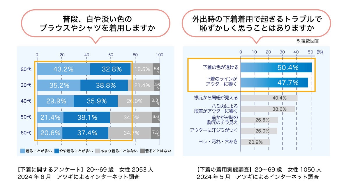アツギの調査によれば、20代から60代女性の6割以上が普段白や淡い色のブラウス、シャツを着用していました。白や淡色のトップスは多くの女性にとって欠かせないアイテムであることがうかがえます。一方、外出時の下着トラブル第一位として挙げられたのが「下着の色が透ける」こと。そこでアスティーグインナーは白や淡色のトップスに透けにくく、ラインが響きにくいアイテムをご提案いたします。