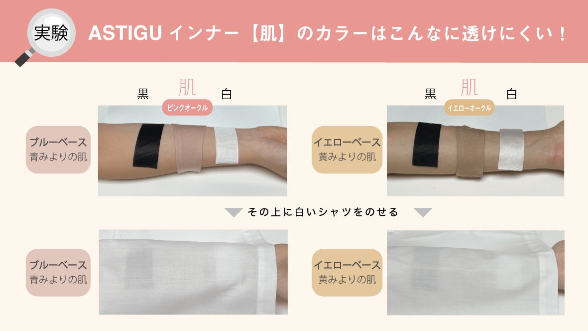 アスティーグインナー【肌】は白や淡い色の服を思い切り楽しむために、透けにくさにこだわった着心地の良いインナーを展開します。
