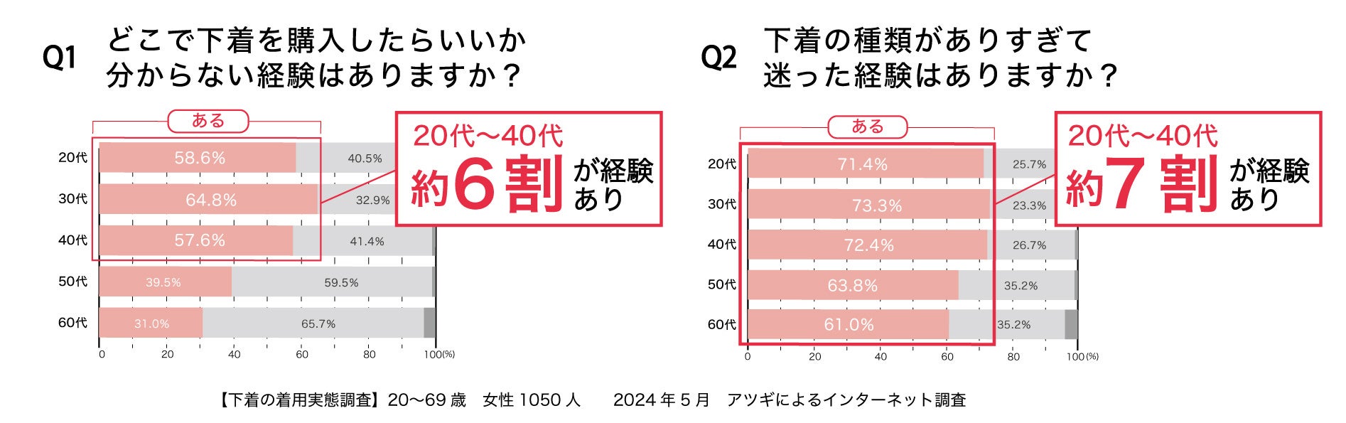 アツギが行ったインターネット調査によれば、20代から40代の女性のうち約6割が「どこで下着を買えばいいか分からない」、20代から40代の女性のうち約7割が「下着の種類がありすぎて迷う」というお悩みを抱えた「下着迷子」であることが分かりました。アツギは「下着迷子」な女性たちのお悩みを解消すべく、漢字一文字で商品特徴を表したパッケージが目印のブランド「アスティーグ」からインナーウェアを提案いたします。