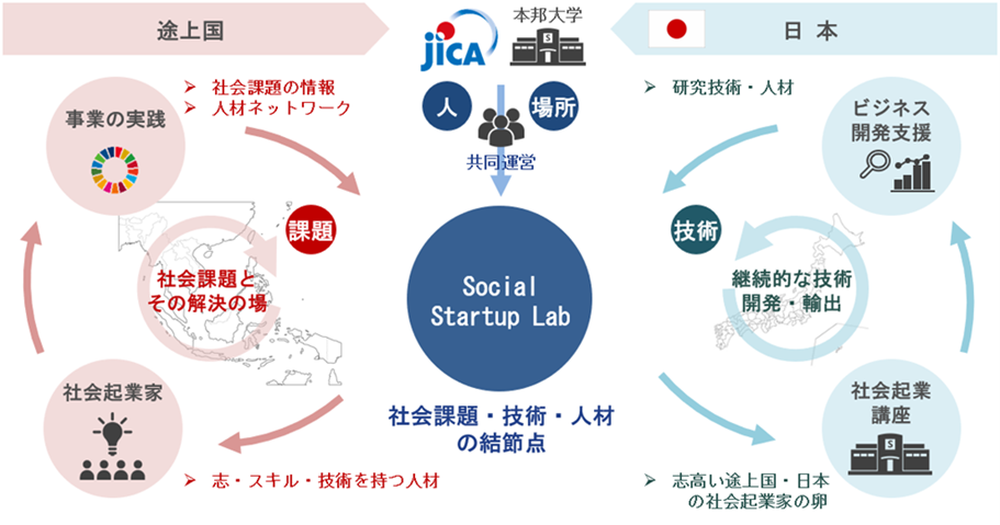 社会課題に関する情報とその解決に資する技術、そして強い志を持つ優秀な人材が出会い、参加者同士の学びと事業開発が促進され、そこで培われる人材ネットワークが更なるイノベーションに繋がるような場として機能する仕組みを「ソーシャル・スタートアップ・ラボ」として実装していきたいと考えています(下図参照)。本事業は第一期(2023年10月~2024年6月)で同ラボの機能や提供価値、各パートナーの役割分担の検討、第二期(2024年7月~2025年6月予定)で研修員の来日を含む同ラボの本格運用に向けたビジネスモデルの仮説検証を進めます。今後、大学や自治体、アクセラレーター、投資家、企業、途上国の関係機関等との議論を重ねて、ソーシャル・スタートアップ・ラボの具体的な機能を検討していきます。