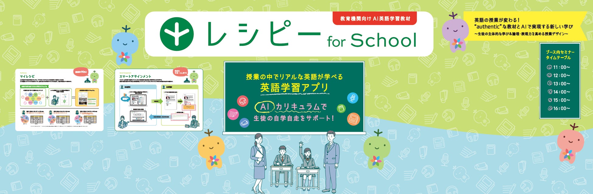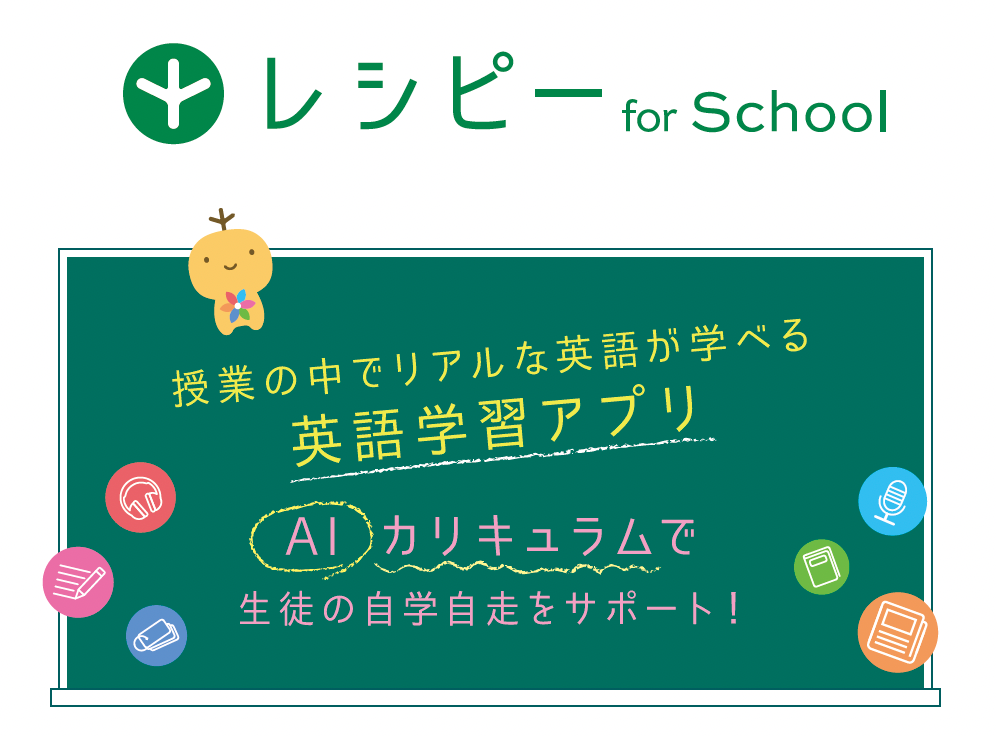 当社は、200万人が利用する英語学習アプリレシピーを教育機関向けに進化させた「 レシピー for School 」をご紹介します。「 レシピー for School 」は生徒の自学自走を促し、先生の課題を解決することを目的とした全く新しいAI英語学習サービスです。