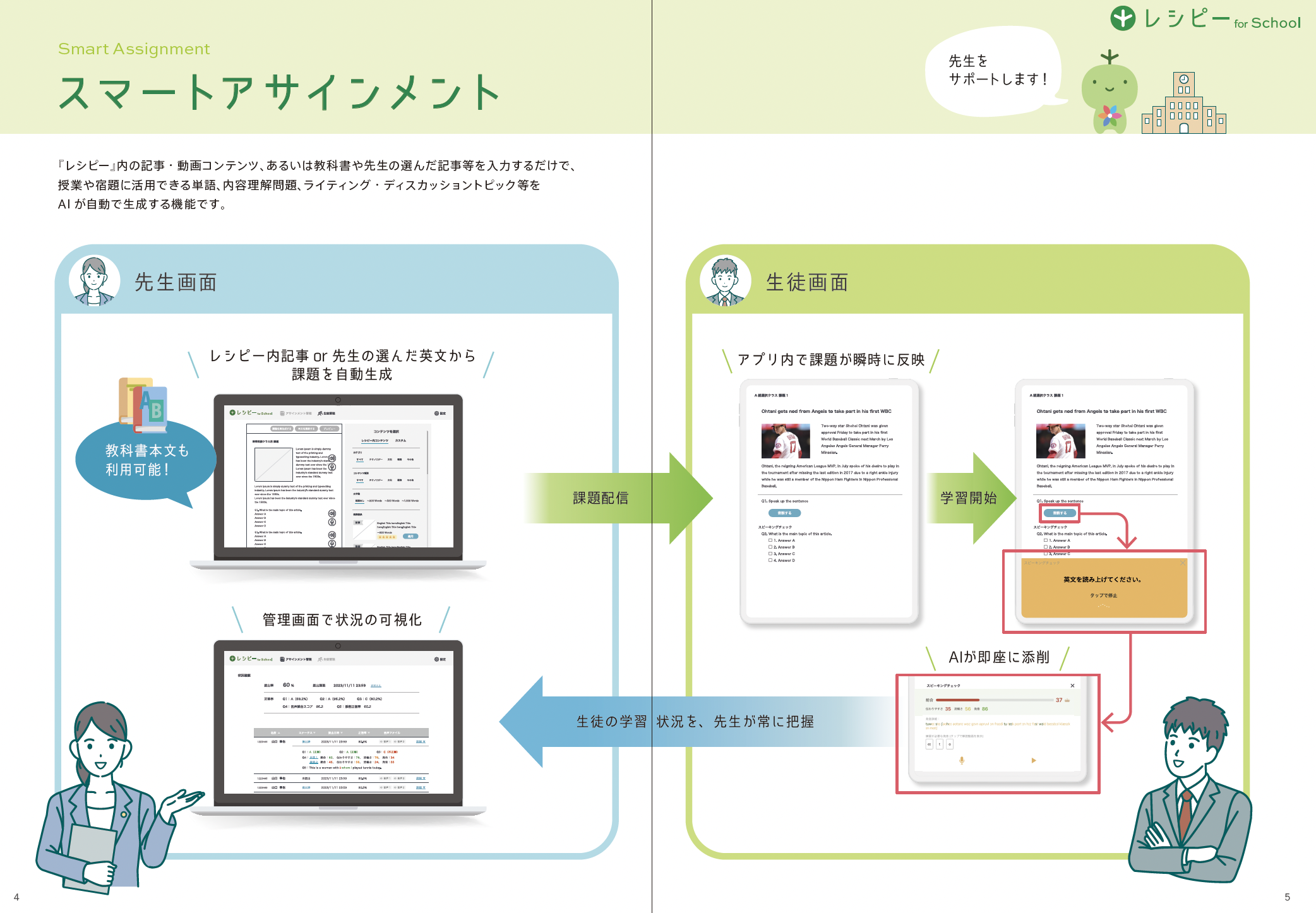 『レシピー』内の記事・動画コンテンツ、あるいは教科書や先生の選んだ記事等を入力するだけで、授業や宿題に活用できる課題として、「単語」「内容理解問題」「ライティング」「ディスカッショントピック」等を AI が自動で生成する機能です。