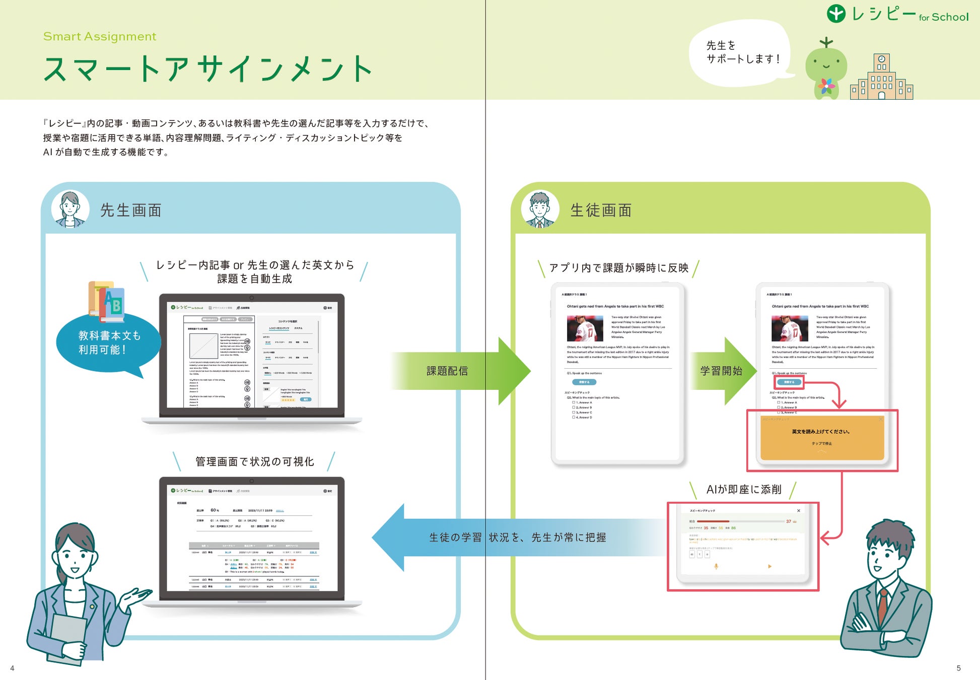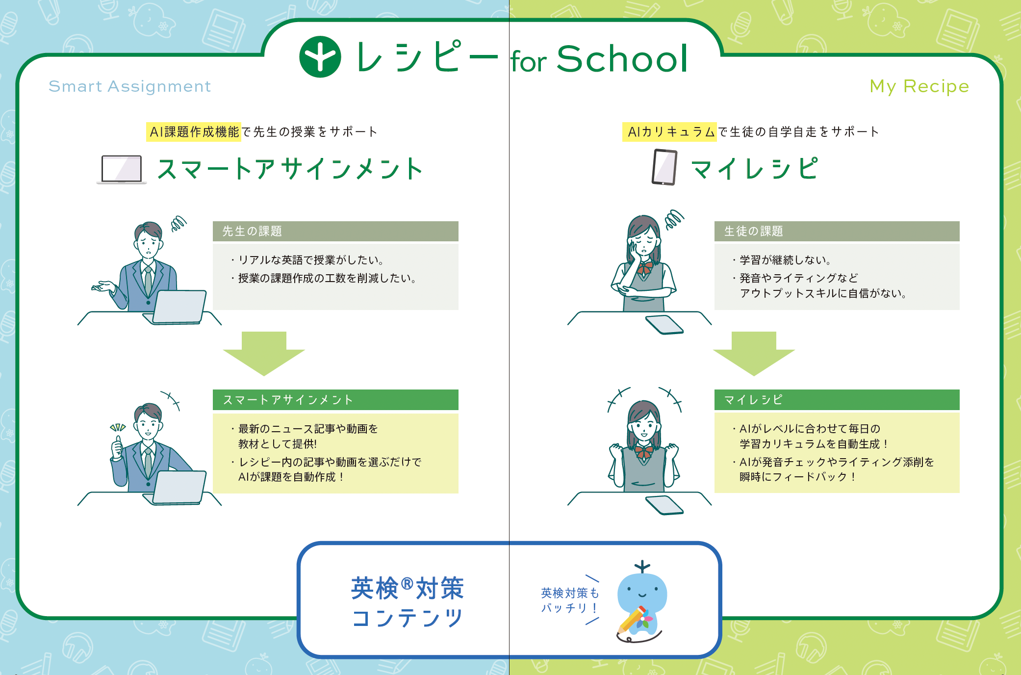 レシピー for School は、生徒の自学自走を促し、先生の課題を解決することを目的とした全く新しいAI英語学習サービスとして、2023年より教育機関向けプログラムとして提供をスタートしております。