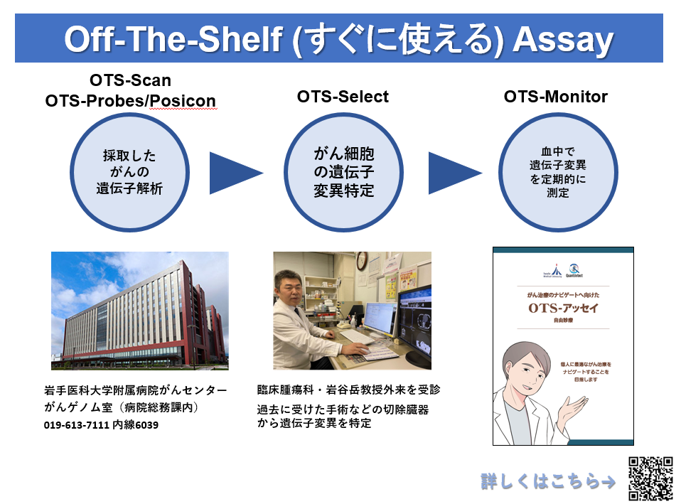 クオントディテクトは進行がん治療とバイオマーカーの研究を行ってきた岩手医科大学医歯薬総合研究所・医療開発部門で開発された技術とノウハウをもとに、「研究成果の社会実装」を目標として設立された企業です。がん治療後の患者を対象に、いち早くがんの再発を発見すること、治療効果を計測すること、無再発であることをしっかりお伝えすることを通して、現在ベストの方策を主治医とともに提案することが、患者の安心感を高めることに繋がるという考えのもと、超高感度プローブ(「探すもの」という意味の試薬)を研究・開発し、社会実装を目指しています。