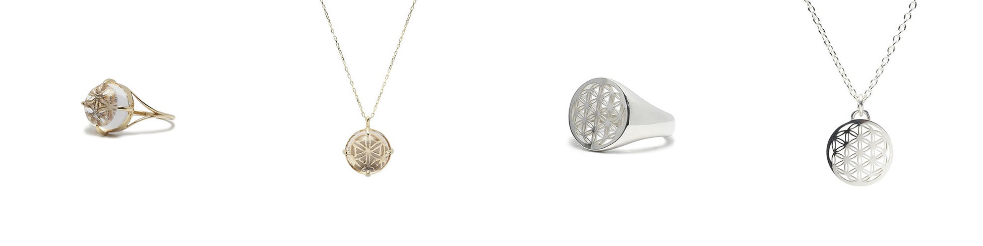 フラワーオブライフは、エネルギーの源、幸運を呼ぶシンボル、あらゆるすべてを内包すると言われ、レオナルド・ダ・ヴィンチも自ら研究に没入したり、超古代文明から伝わったとされる未知の図形です。心安らぐお守りセラピーから幻覚を呼び起こすSF的なアセンションまでコンセプトや秩序性とは一線を画した、嘘のような本当かものスピリチュアル=ニューエイジなジュエリーの展開。