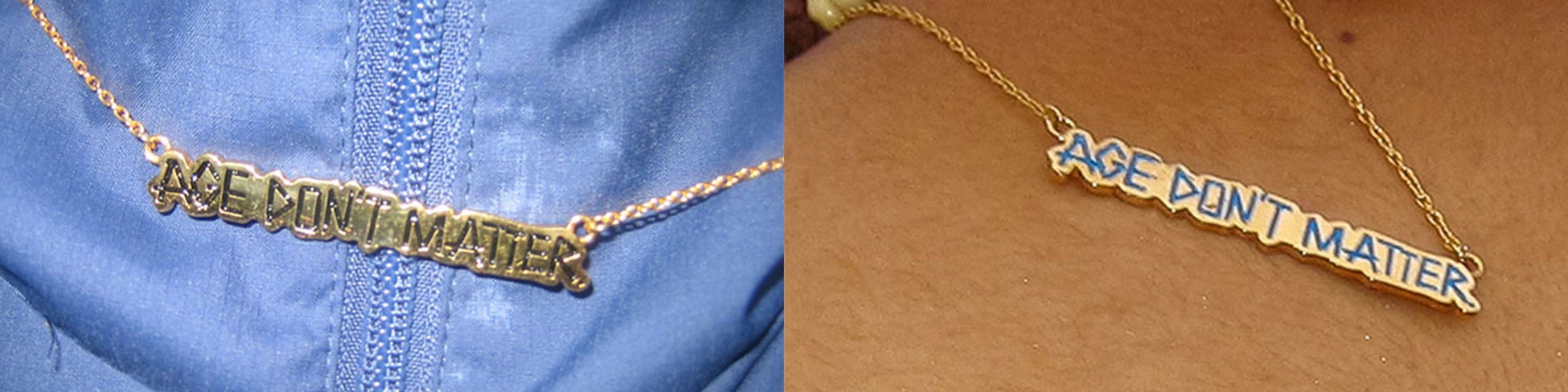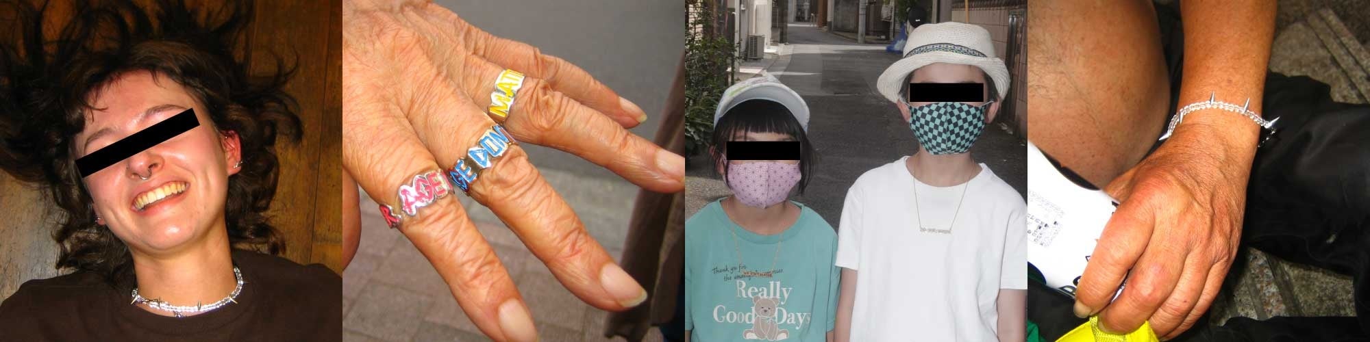 エイジドントマターとニコJAMマークのグラフィックを用いたジュエリーコレクション。黒バーも使いながら、CMYKカラーを採用しました。(黒バーについては別紙参照)