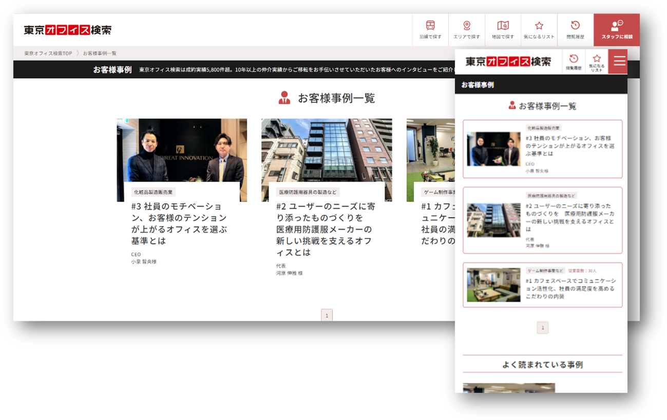 「お客様事例」ページでは、オフィス移転を計画するタイミングやこだわりポイント、オフィス移転時の苦労話など、「東京オフィス検索」を利用したさまざまな業種業態のお客様の生の声をインタビュー形式でお届けします。