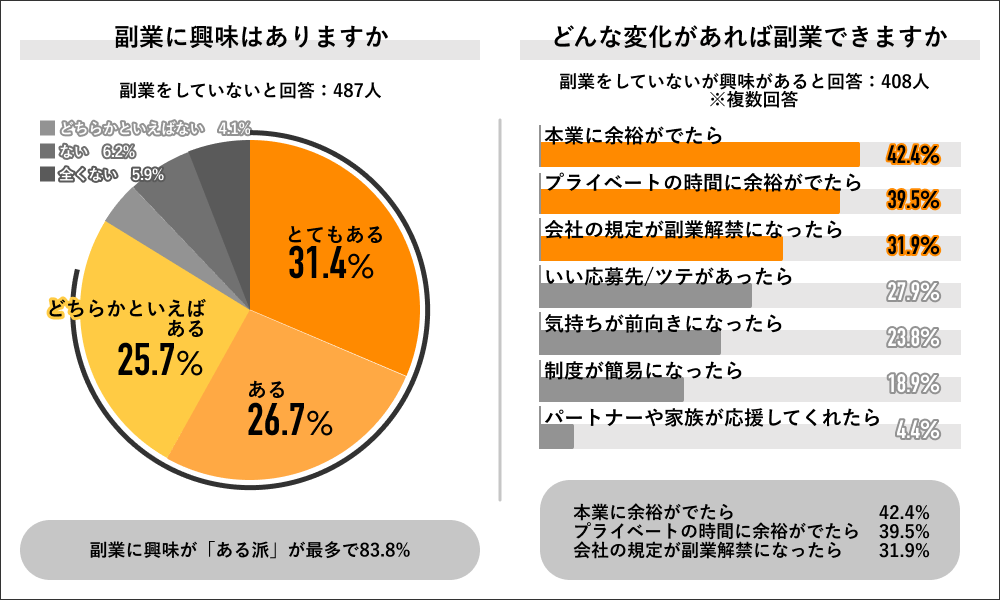 副業をしていないと回答した487人に副業への興味有無を聞くと「ある派」が83.8%と過半数を占め、内訳は「とてもある」31.4%、「ある」26.7%、「どちらかといえばある」25.7%となりました。副業をしていないが興味はあると回答した408人にどのような変化があれば副業ができるかを聞くと「本業に余裕が出たら」が42.4%で最多回答となり、次いで「プライベートの時間に余裕が出たら」39.5%、「会社の規定が副業解禁になったら」31.9%が上位3つの回答となりました。