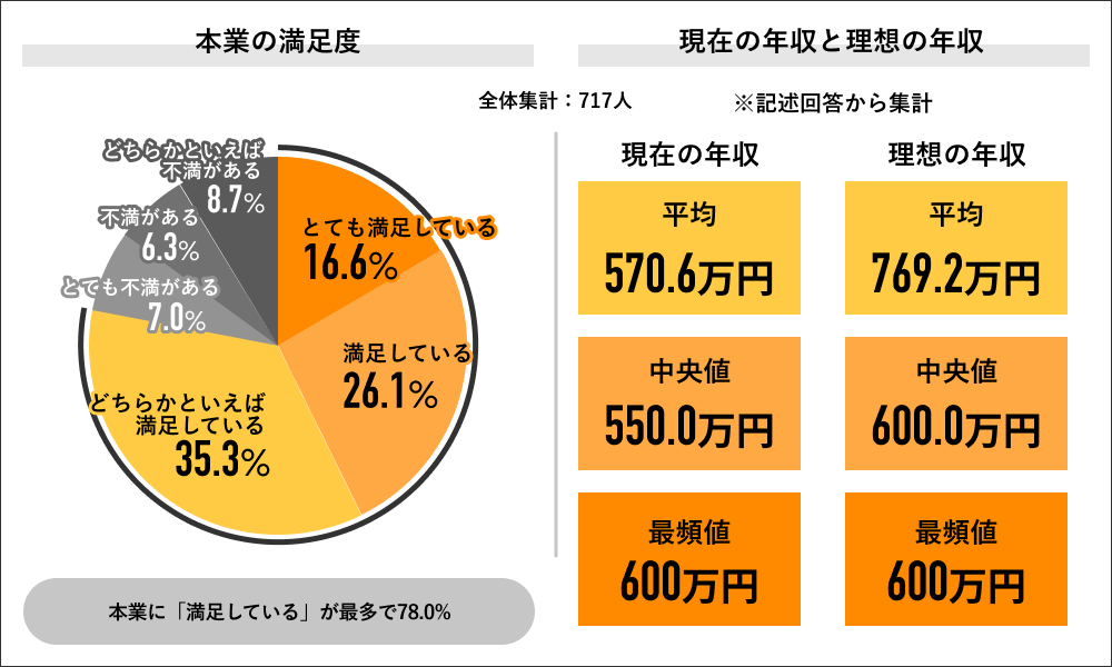 回答者全体の717人に本業の満足度を聞くと「満足している派」が78.0%と過半数を占め、内訳は「とても満足している」16.6%、「満足している」26.1%、「どちらかといえば満足している」35.3%でした。また、同回答者に現在の年収額を記述回答にて聞くと、平均額は570.6万円、中央値が550.0万円、最頻値が600.0万円となりました。現在の年齢及びスキル状況で得たい理想の年収額を記述回答にて聞くと、平均額は769.2万円、中央値が600.0万円、最頻値が600万円となり、実際の平均年収額に比べて理想額が198.6万円高い結果となりました。
