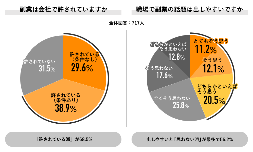 回答者全体の717人に副業が会社で許されているかを聞くと「許されている派」が68.5%と過半数を占め、内訳は「条件なし」が29.6%、「条件なし」が19.8%で、「許されていない派」は31.5%でした。同回答者に職場での話の出しやすさを聞くと出しやすいと「思わない派」が56.2%と過半数を占め、内訳は「全く思わない」25.8%、「思わない」17.6%、「どちらかといえば思わない」12.8%となりました。