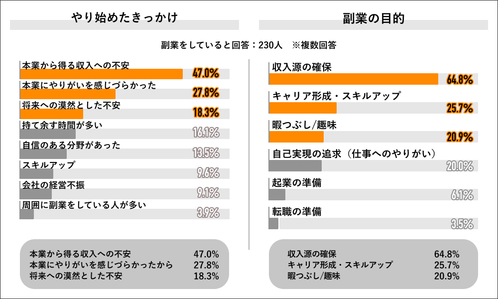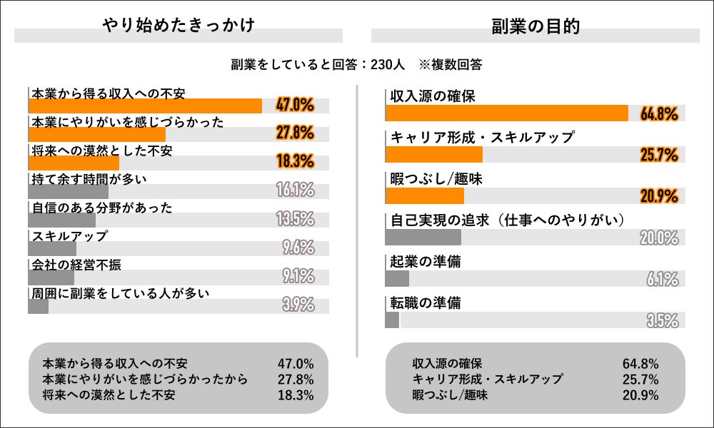 副業経験ありと回答した230人に副業を始めたきっかけを聞くと「本業から得る収入への不安」が47.0%で最多となり、次いで「本業にやりがいを感じづらかった」が27.8%、「将来への漠然とした不安」が18.3%と、上位3つの回答となりました。同回答者に副業の目的を聞くと「収入源の確保」が64.8%で最多となり、次いで「キャリア形成・スキルアップ」が25.7%、「自己実現の追求(仕事へのやりがい)」が20.9%が、上位3つの回答となりました。