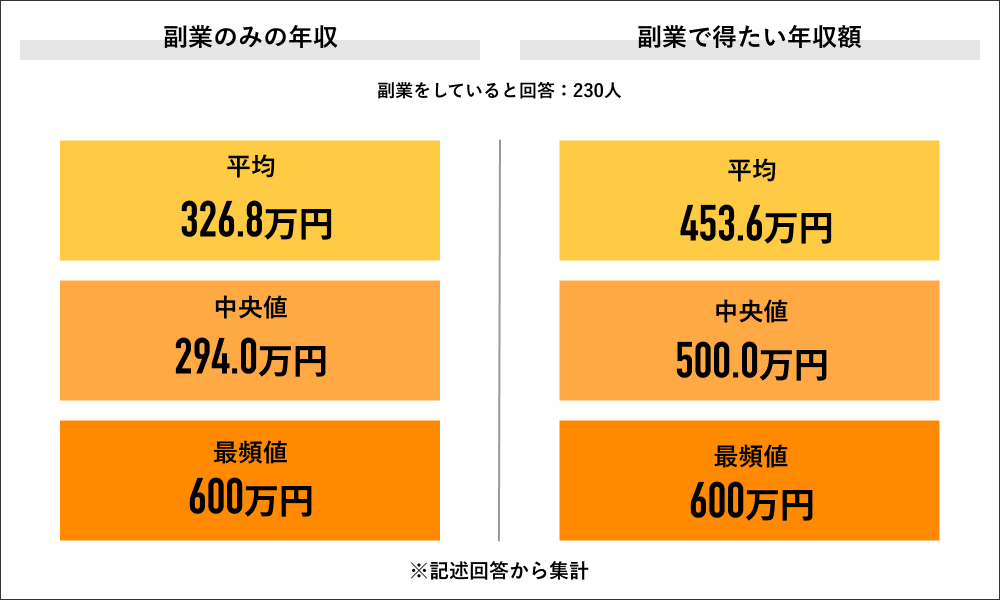 副業経験ありと回答した230人に副業のみの年収額を記述回答にて聞くと、平均額は326.8万円、中央値が294.0万円、最頻値が600万円となりました。同回答者に副業で得たい理想の年収額を記述回答にて聞くと、平均額は453.6万円、中央値が500.0万円、最頻値が600万円となり、理想の平均年収額に比べて実際の額が126.8万円高い結果となりました。