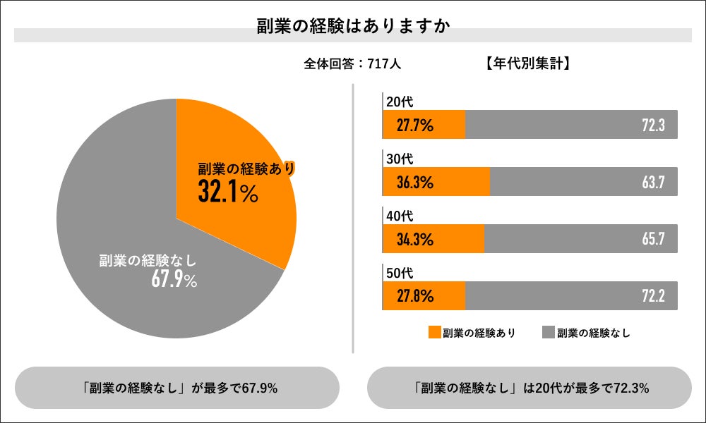 回答者全体の717人に人副業の経験有無を聞くと「経験あり」が32.1%、「経験なし」が67.9%で、”経験なし派”が多数となりました。年代別の回答では20代の「経験なし派」が72.3%で最多となり、次いで50代が72.2%、40代が65.7%、30代が63.7%と、若手の次に中堅層の未経験者が多数の結果になりました。