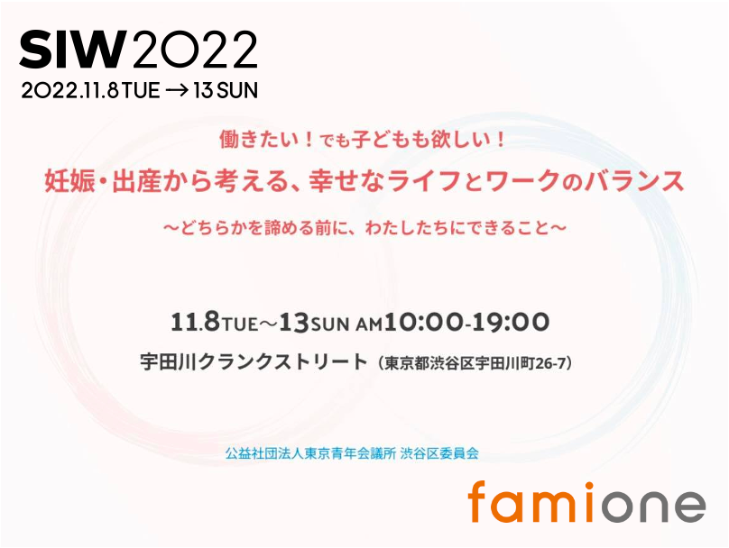 「子どもを願うすべての人によりそい幸せな人生を歩める社会をつくる」をビジョンに掲げ、LINEを活用した妊活コンシェルジュサービス「famione(ファミワン)」 https://lp.famione.com/ を提供する株式会社ファミワン(本社:東京都渋谷区、代表取締役:石川勇介、以下当社)は、一般社団法人渋谷未来デザイン(代表理事:小泉秀樹以下、渋谷未来デザイン)が11月8日(火)から開催する「SOCIAL INNOVATION WEEK SHIBUYA 2022」(以下SIW)にて、宇多川クランクストリートにおけるブース出展と、YouTube LIVE出演を行うことを決定いたしました。