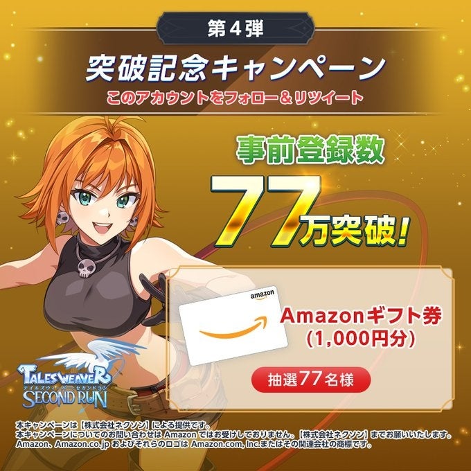 おかげさまで事前登録者数は77万人を突破!これに合わせて、事前登録者数に応じて合計当選人数がアップする「突破記念キャンペーン」の第4弾を追加いたしました。現在、第1弾~第4弾までの合計で、167名様にAmazonギフトカード 1,000円分のプレゼントが決定しております。