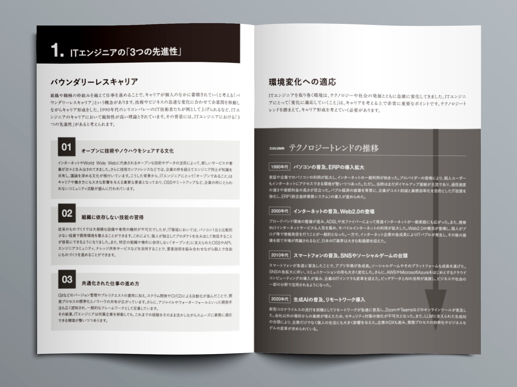 ITエンジニアには、他職種と比べて「オープンに技術やノウハウをシェアする文化」「組織に依存しない技能の習得」「共通化された仕事の進め方」という3つの特性があります。変化の激しいテクノロジートレンドを踏まえながら、ITエンジニアの先進性について解説します。