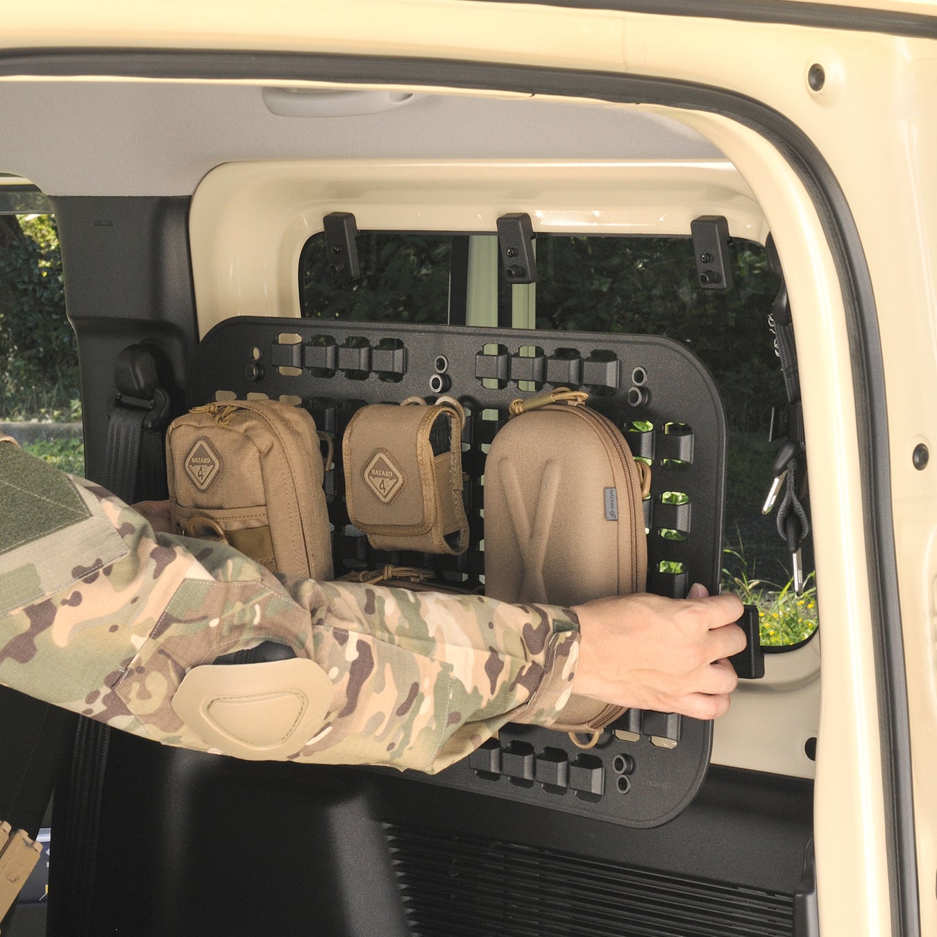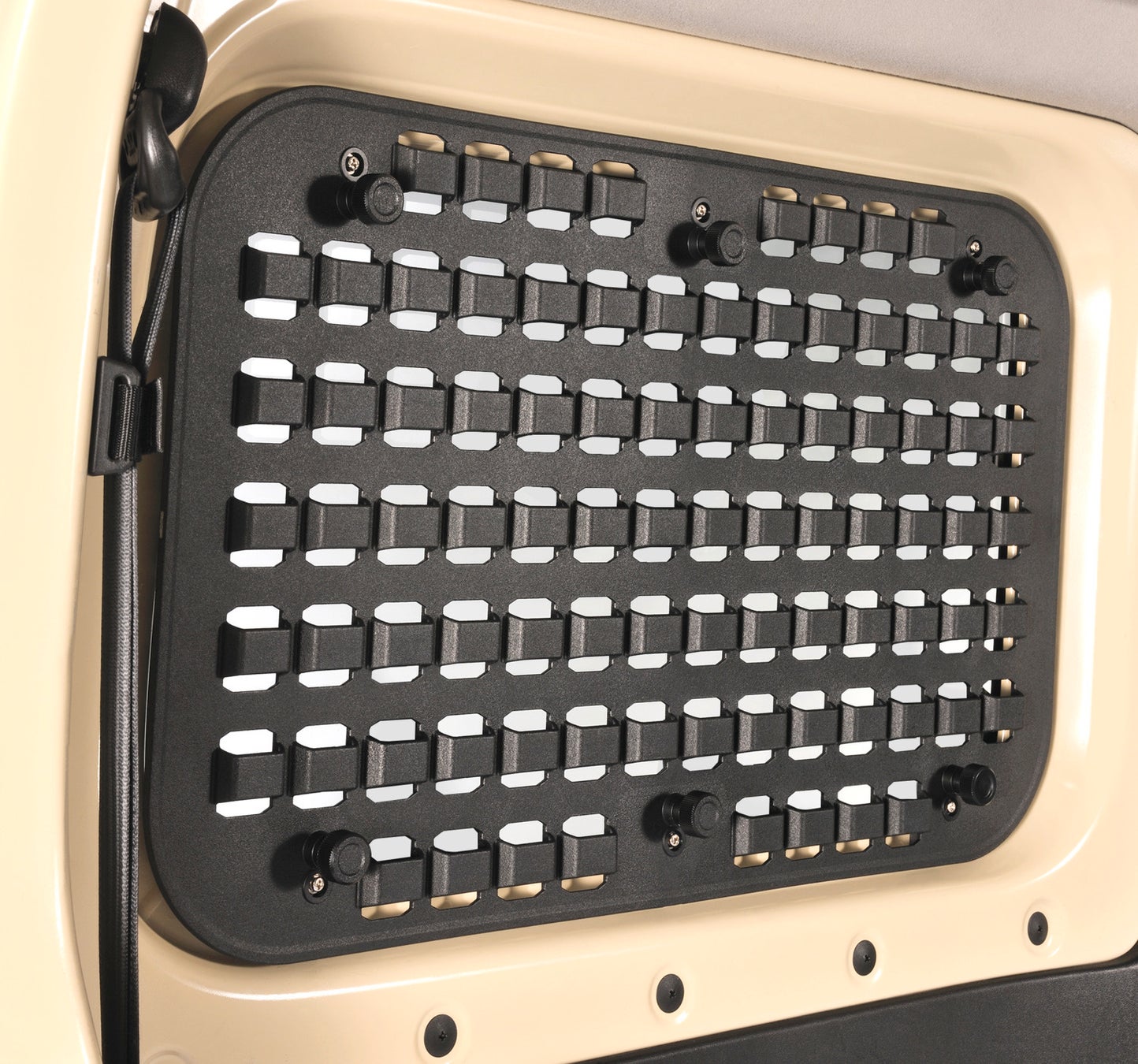 近年、"モールシステム"に対応した車のカスタマイズアイテムが、キャンパーやサバイバルゲーム愛好者の中で見かけるようになりました。そこで、オリジナルのカスタマイズを楽しむユーザーが多いジムニーにおいて、壁面収納に役立つ専用設計のパネルを開発しました。ポーチを始めとした"モールシステム"対応アイテムのベルトが通しやすいよう、凹凸のあるオフセット構造を採用。また、付属のアタッチメントを活用することでアウトドアなどの小物類も収納することができます。