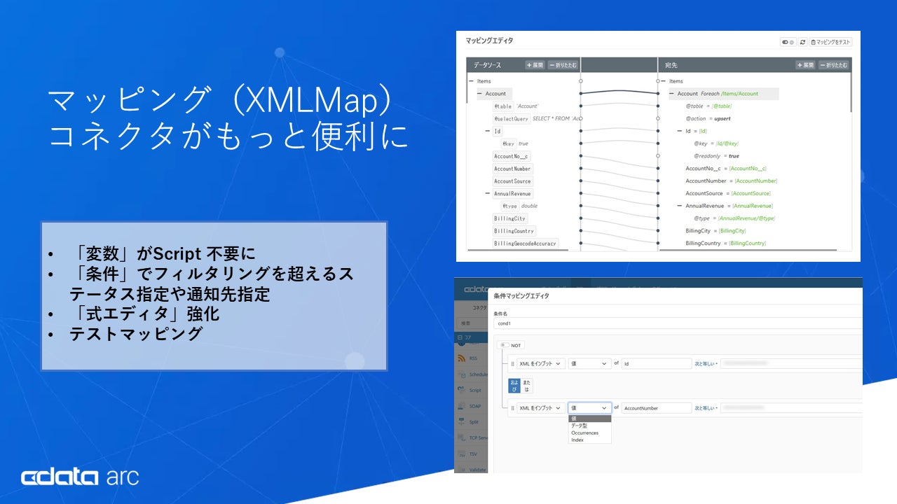 CData Arc は、データの操作と変換の中間形式としてXML を使用します。コネクタ同士をつなぐマッピング用のXMLMap コネクタは、CData Arc の中でも中核的なコネクタです。今回のリリースでは、このXMLMap コネクタの機能が大きく強化されています。