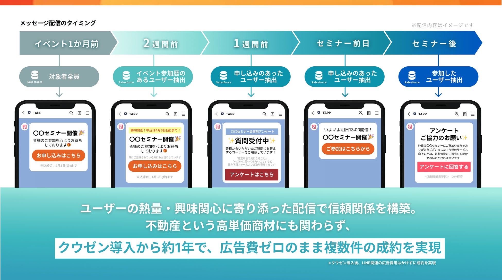 TAPP様では、お客様の利益を生み出すパートナーとして、物件販売後の長期的なサポートを重視してきました。 しかし、イベント告知や重要なお知らせにおいて、メールの開封率低下により情報が十分に行き届かず、営業担当が個別に電話フォローを行わなければならない「二重の手間」が課題となっていました。 また、連絡手段として利用していた「LINE WORKS」は運用が個人に委ねられており(属人化)、担当変更時にお客様とのこれまでの関係性や「温度感」を引き継ぐことが困難でした。これらの課題を解決し、お客様とよりスムーズに繋がるため、まずは「LINE公式アカウント」の導入を決定しました。 さらに運用にあたっては、 「もっと身近で、信頼できるパートナーでありたい」という想いを実現するため顧客情報基盤である「Salesforce」と柔軟に連携でき、全社的に均一で質の高いコミュニケーションが可能となる「クウゼン(KUZEN)」を選定いただきました。